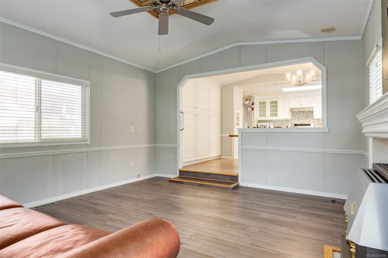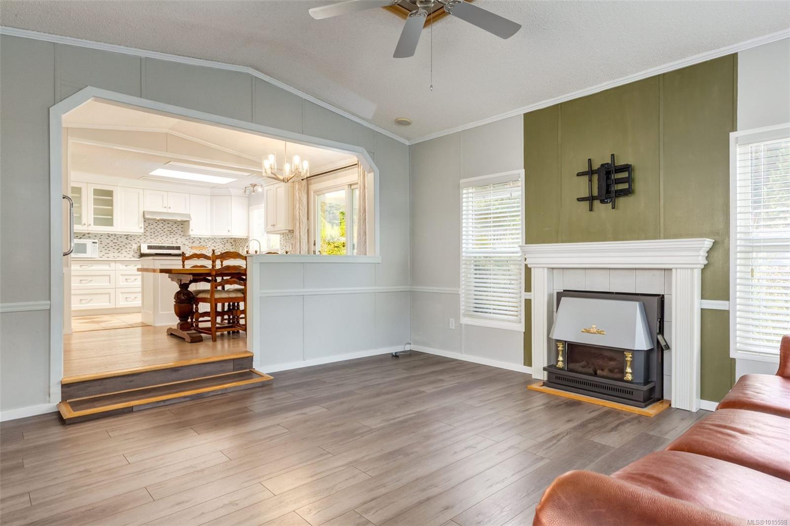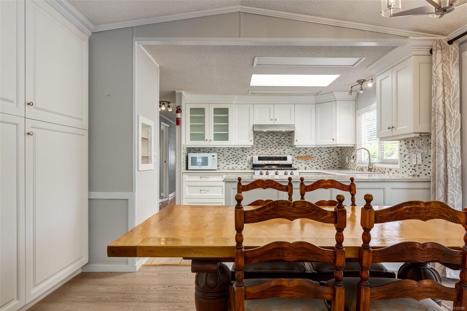 Newer patio doors lead to the covered deck, and three sheds—two powered—offer flexible storage or workspace. This 55+, pet-friendly park is ideally located near Colliery Dam Park, Morrell Sanctuary, shopping, ferries, and airport access.